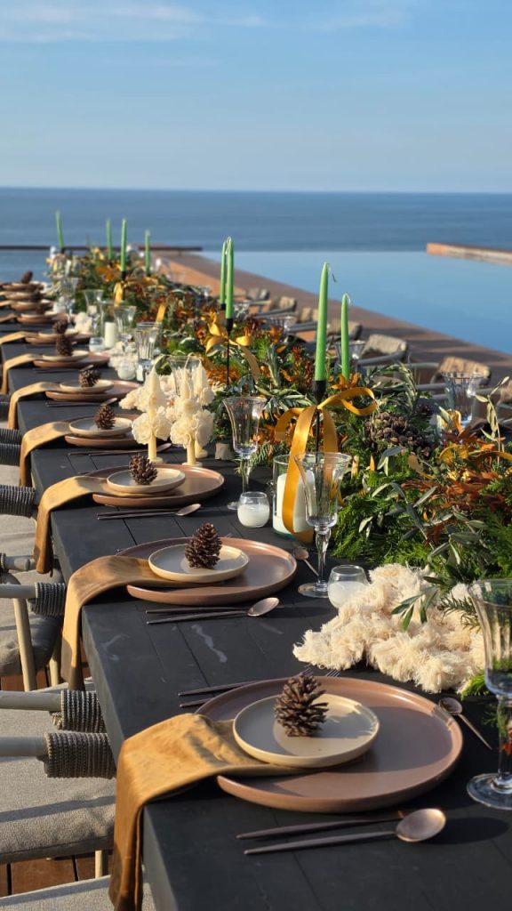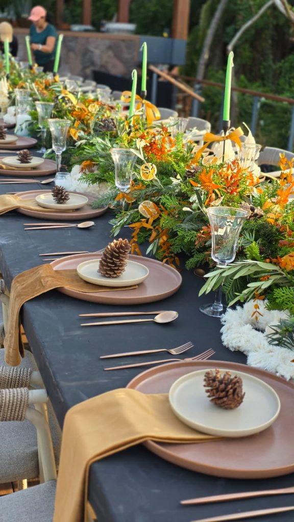 Uno de los grandes aciertos de esta celebración fue integrar elementos navideños sin romper con la estética bohemia. La clave está en la moderación y coherencia visual. Tonos cálidos, texturas naturales y detalles bien seleccionados lograron transmitir el espíritu festivo sin perder la frescura del entorno tropical.